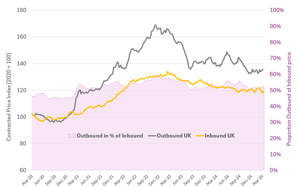Despite both directions experiencing price declines between Q3 2022 and Q4 2024, we now observe a more stable environment. The rate imbalance has stabilized at 51.6% in Q1 2025, still 7 percentage points above Q4 2020 levels. While COVID-19 had a short-term impact, Brexit appears to have instigated a lasting shift. This enduring change in imbalance is likely due to reduced competition for outbound transports, as UK specialists consolidate operations, leveraging their expertise to navigate administrative complexities. Additionally, local UK carriers, operating on a different cost basis, have bolstered outbound prices.