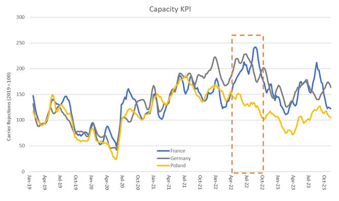 The above chart shows the development of contracted load rejections per country. A transport is thereby counted as rejected if the first assignment attempt is timed out or actively rejected by the contracted carrier. We clearly see that the three markets (France, Germany, Poland) exhibit a similar trend until 2022. During spring 2022 the rejections in Poland decreased while in France and Germany they climbed to new heights. After reaching new baseline levels in Q4, we see in 2023 again a coupling to the overall trend & seasonality. So, what happened during spring? The war in Ukraine started with a tremendous impact on the market, but why was this different in Poland?