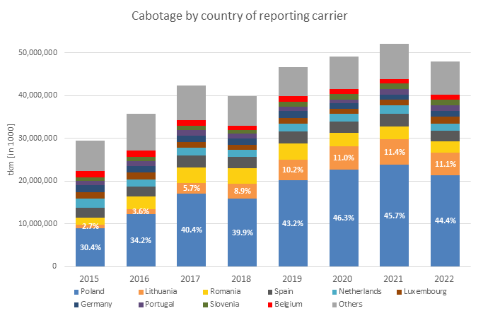 The figures show that cabotage within Europe was mostly driven by carriers from Poland and Lithuania. It further confirms that cabotage transports decreased in 2022 for both. Combined with the visible loss of market share the theory above can be confirmed, too.