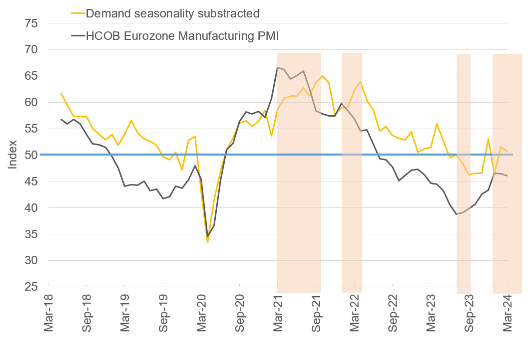 Since the PMI is inherently a forward-looking metric, we should ideally be able to see a correlation and predict trend changes for demand as they occur.