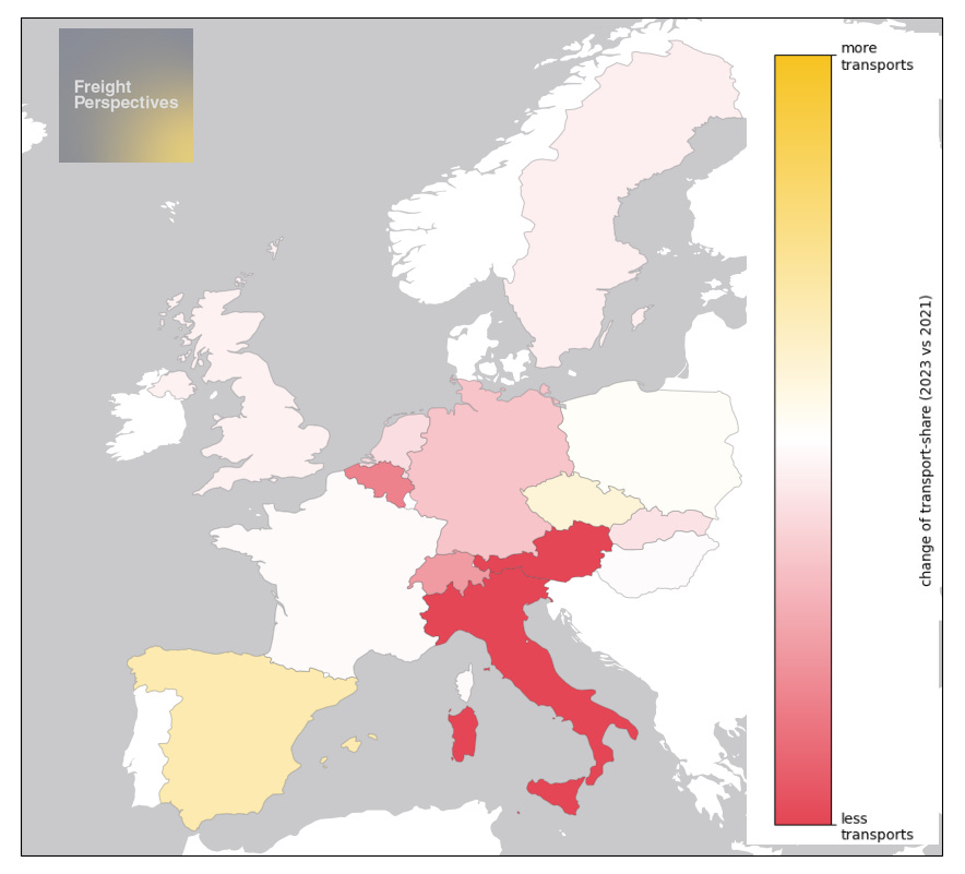 Decreases in overall amount of shipments are obvious and the map illustrates the general economic downturn in 2023. Trades sustaining this overall trend are Spain (+1,8%), Czechia (+0,9%) to Germany whose volumes grew against the trend. In contrast, flows from Italy (-16%), Austria (-9,8%) and Belgium (-3,4%) showed significant reductions.