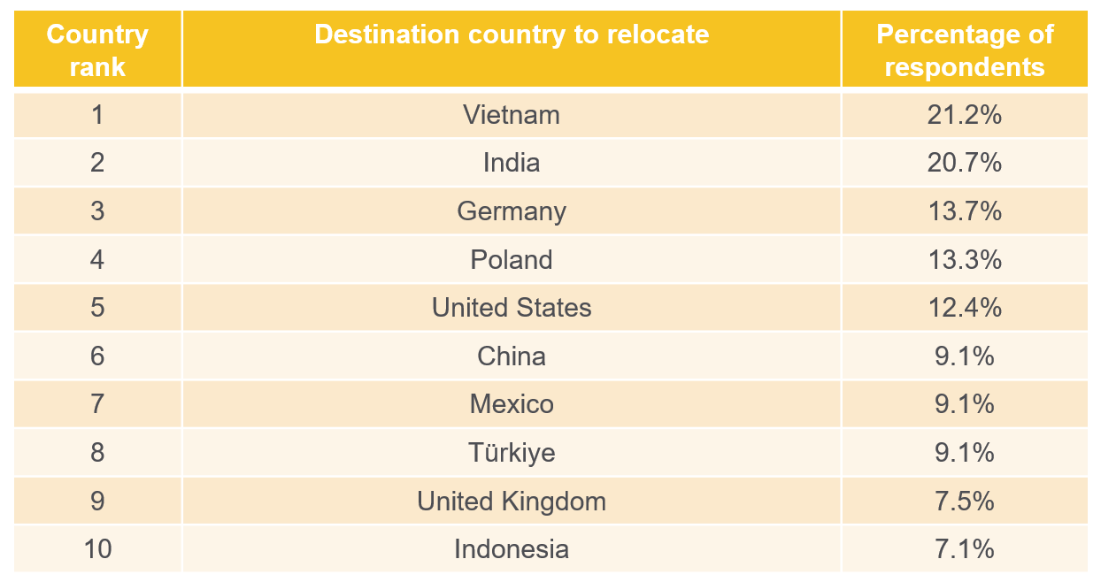 As these measures aim to shift production or sourcing locations. We need to expect that reshoring, nearshoring and near-sourcing will directly impact European transportation and consequently increase the demand of transportation services. Reuters Events in partnership with Maersk published a supply chain white paper in 2023. This paper includes results of a survey among 368 supply chain professionals, who indicated below listed countries as their preferred relocation sites. It shows that the biggest relocation potential lies within Asia, but also Germany and Poland within Europe are ranked amongst the first places.
