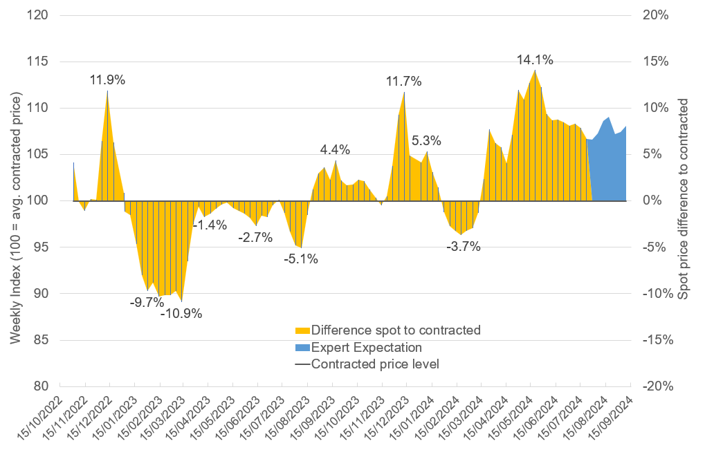 Each value represents the difference between spot prices and contracted prices within a specific week (Index 100). For instance, in week 21 of 2024, spot prices peaked at 14,1% above contracted price levels.