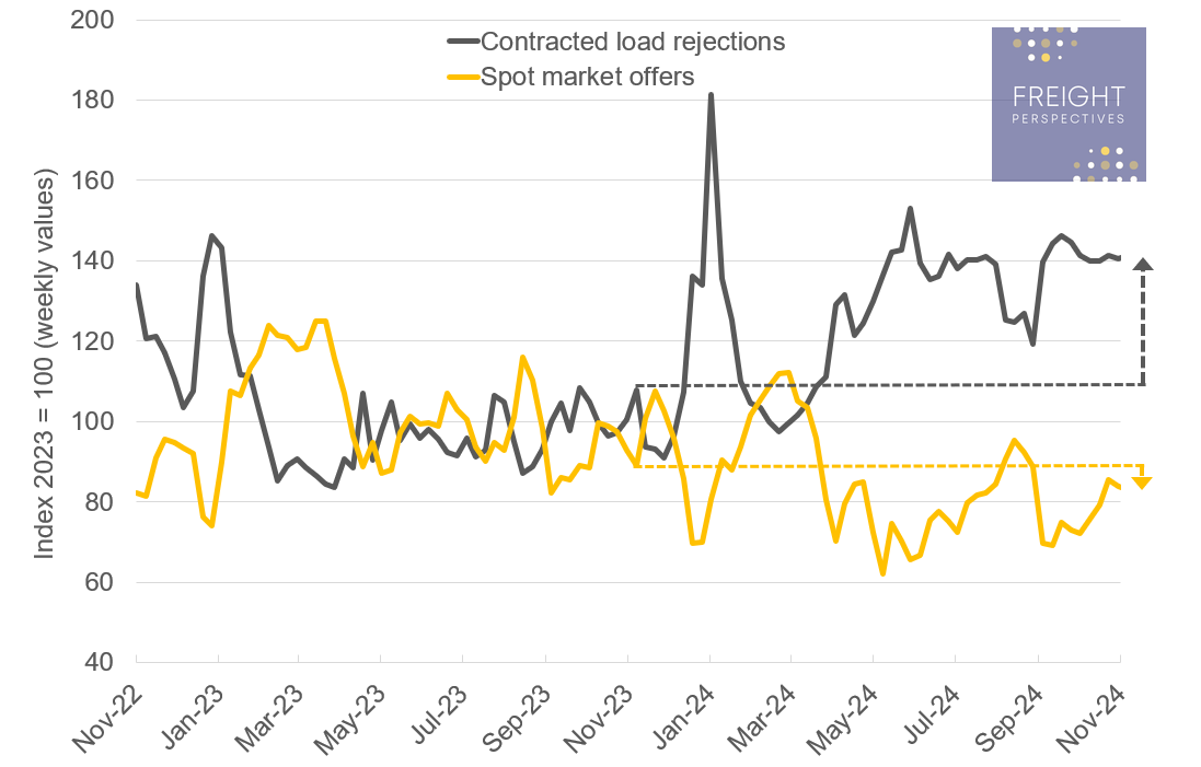 Unfortunately for the contracted side, this spells challenges. Rejections will remain high and are likely to further increase. While early November might offer some relief, I predict a significantly tighter capacity situation during the 2024 Christmas peak compared to last year. Come December, we may see record-high rejections and challenging operational conditions in capacity provision.
