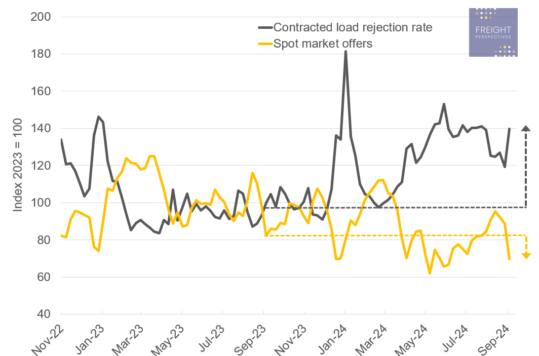 Unfortunately for the contracted side, this means rejections will probably stay high. Although there may be some relief towards November, I expect a tighter capacity situation during the Christmas peak in 2024 compared to last year. This is because some trucks that have served the contracted side might shift more to the spot market, chasing higher margins, and the overall lack of fleet additions.