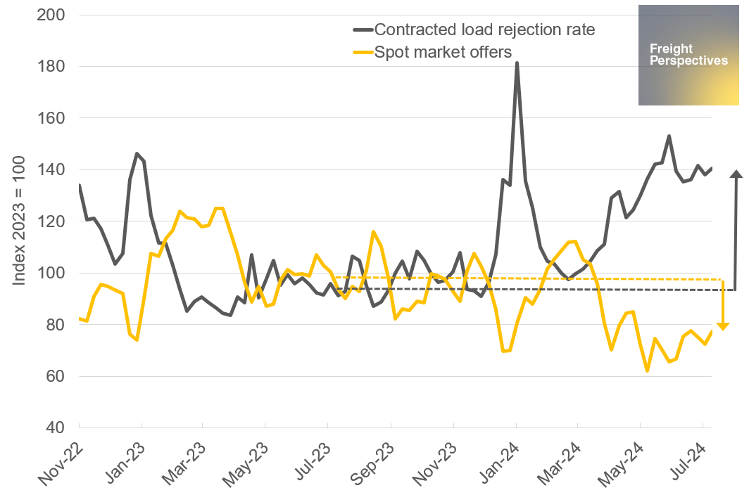 For the contracted side, this unfortunately means no good news, as rejections are likely to remain elevated. This is because some trucks that primarily served the contracted side in recent months will probably increase their spot market service share, following the higher margins possible in this segment.