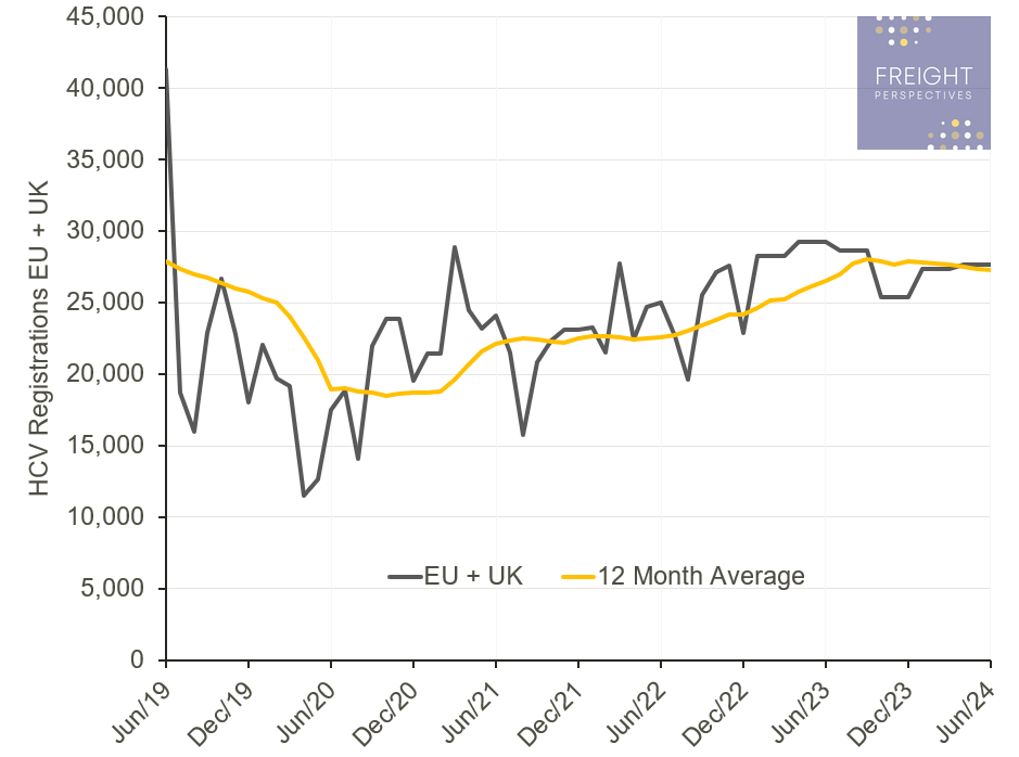 The high overall registrations in 2023 and still elevated 2024 figures don't necessarily indicate a proportional increase in the available fleet. Given the driver shortage and the overall economic situation, we are likely seeing an ongoing fleet modernization rather than enlargement. Reliable de-registration figures are not available and some press releases and financial statements mention fleet decreases and driver shortages. For these reasons we even can’t rule out a decrease in the available fleet.