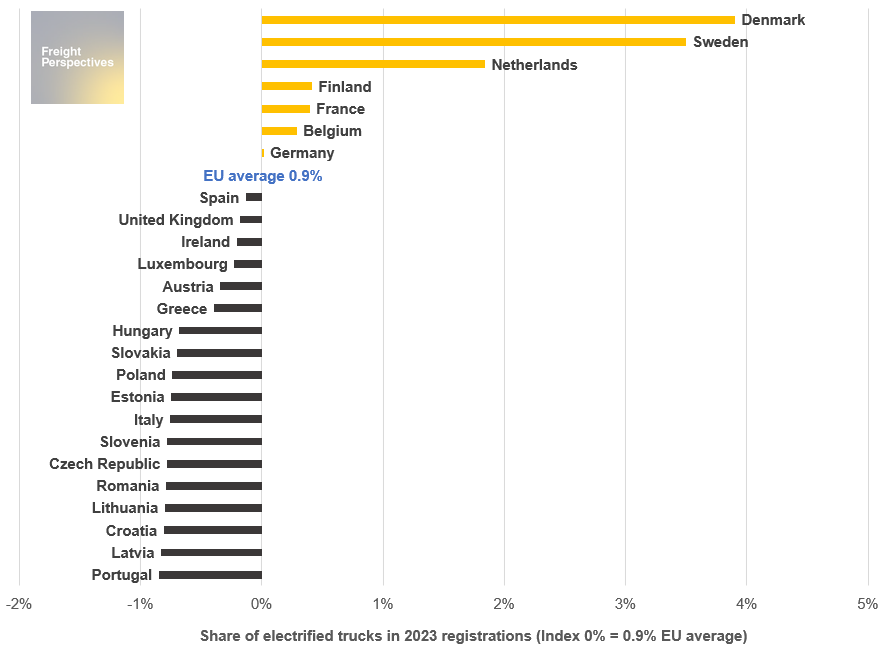 The baseline of the index in the chart above is the EU average of 0.9% as a share of electrified trucks within 2023 total registrations (e.g. Swedens’ share of electrified trucks is 4.4% (0.9% + 3.5%)). It is not surprising that the Nordics and BeNeLux countries are at the top, given the structure of their markets and main business areas (regional high quality service) of carriers within these countries.