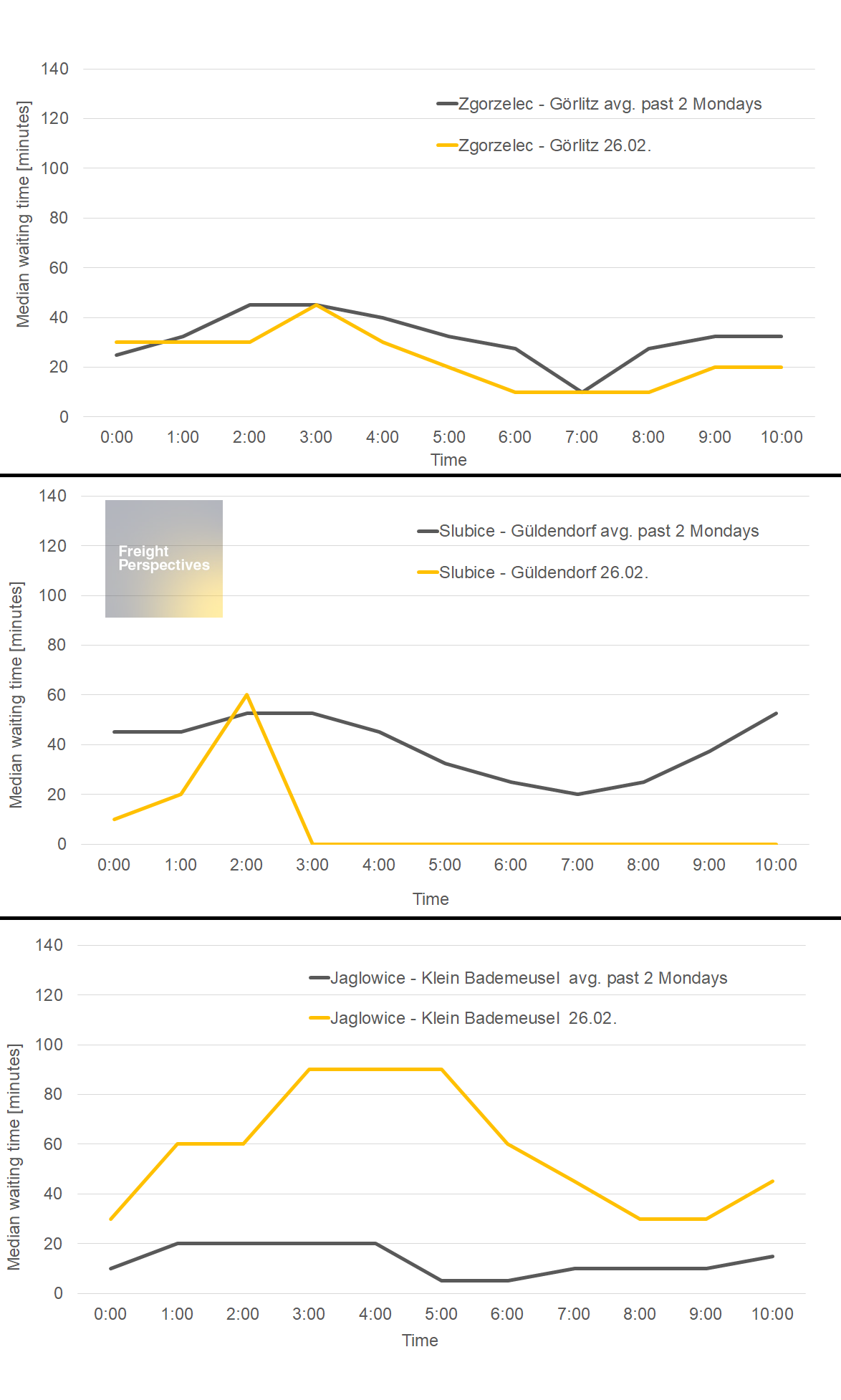 The following analysis compares three important borders between Poland and Germany, with Slubice to Güldendorf as the blocked one. Therefore, current data is missing for this border, as trucks have started to avoid it.