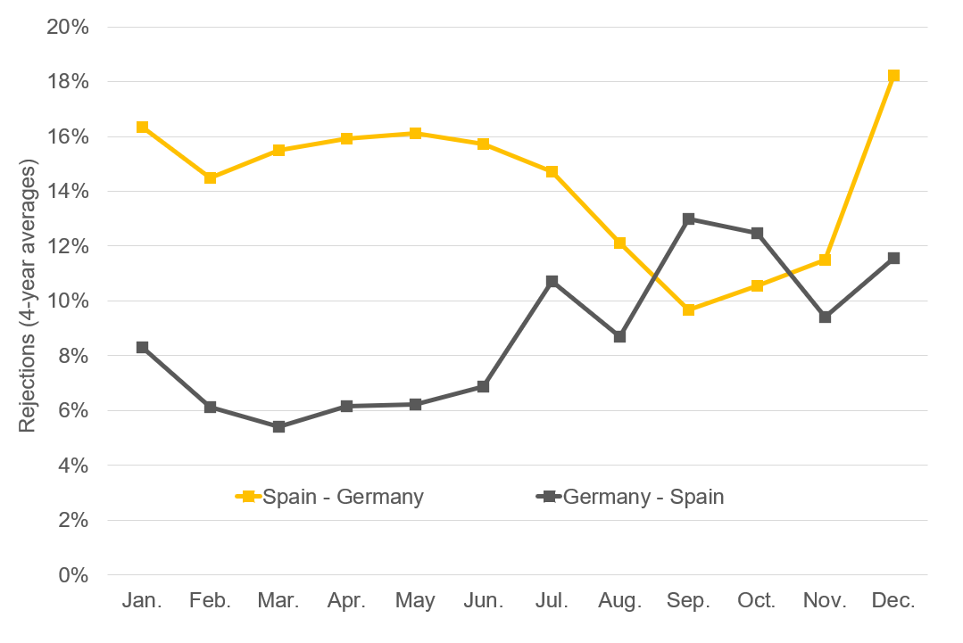 The following analysis focuses on the structural situation of capacity and rejections between transports from Spain to Germany and vice versa. Therefore we calculated the average rejections for each month over the past 4 years per trade to identify fundamental market structures.