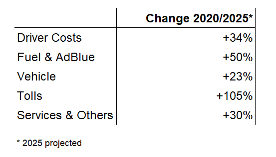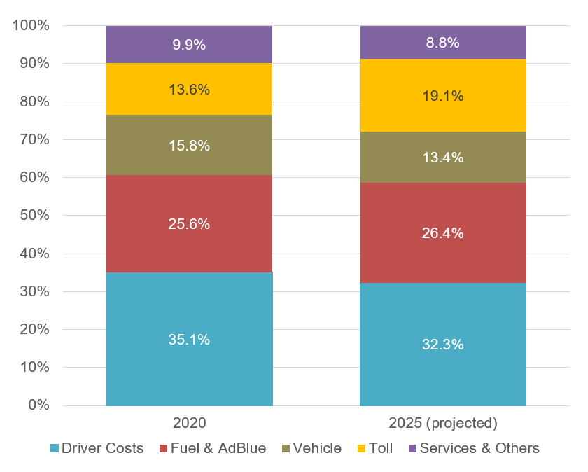 Given this evolution, a shift in cost shares is the logical consequence. Starting from 13.6% in 2020, toll costs are expected to reach a total cost share of 19.1% in 2025, surpassing vehicle costs to become the third-largest cost component.