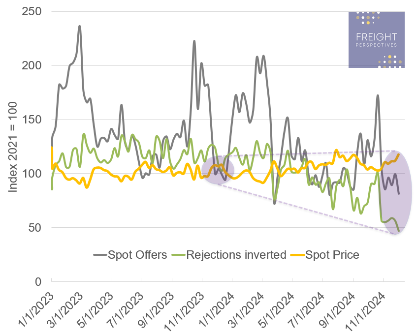 The highlighted sections in the chart enable easy year-on-year comparison by marking corresponding weeks. The data shows notable differences when compared to 2023. Rejections have sharply decreased, which is the main indicator of this trend and points to tight capacity in the market. The reduced number of spot market offers reinforces this assessment. Consequently, prices are trending upwards - a natural reaction to the constrained capacity. This movement across all KPIs align with the typical patterns as we near the busy pre-Christmas rush.