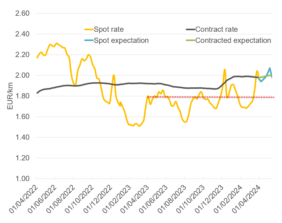 Easter usually marks the first substantial increase in spot rates within a calendar year, marking the end of Europe's low spot price season. This trend is also evident for Germany, as displayed in the graph below. The sharp increase in contracted prices at the start of the year and the less pronounced decreases in spot rates after December are largely due to toll increases. The red dotted line shows this difference in spot rates, comparing Easter prices of 2023 with this year’s values (+13,3%).