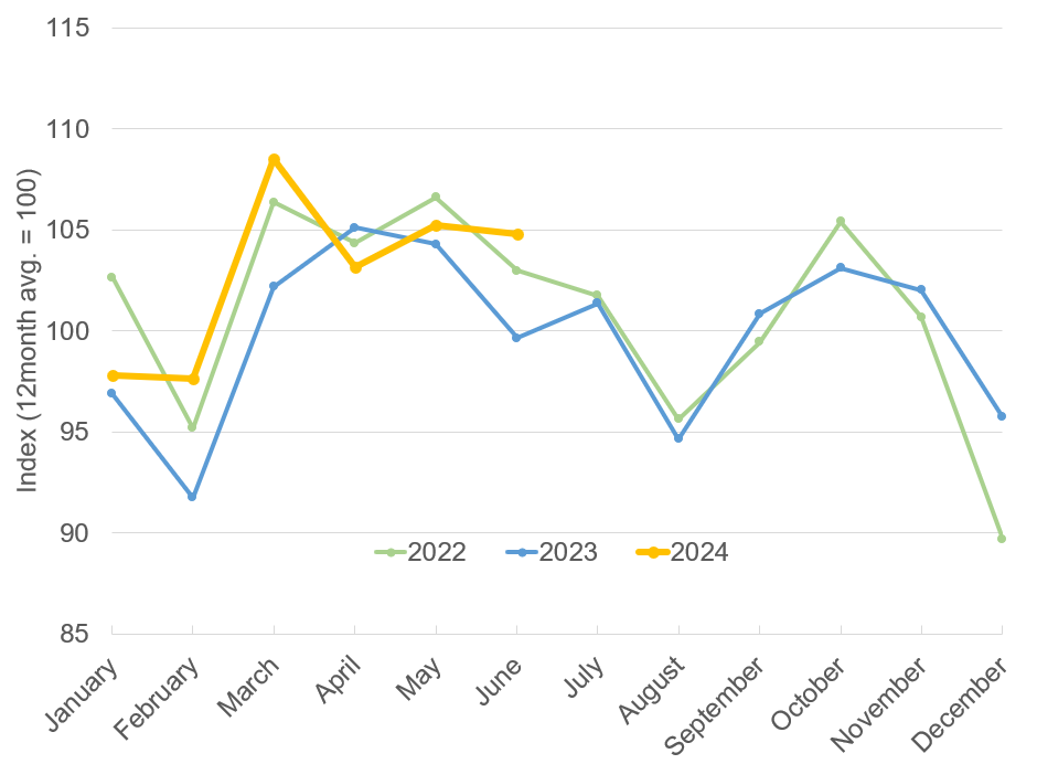 From a methodology perspective, we can’t directly compare year-to-year values, but we can identify trends. Values above 100 indicate more distance driven in a given month compared to the past 12-month average; values below 100 indicate less. In addition, monthly values, influenced by the last 12 months, reveal trends over time. By adding data from the past two years, we can also assess the seasonality. In this context, truck activity increased in May and remained high in June despite the usual seasonal trend.
