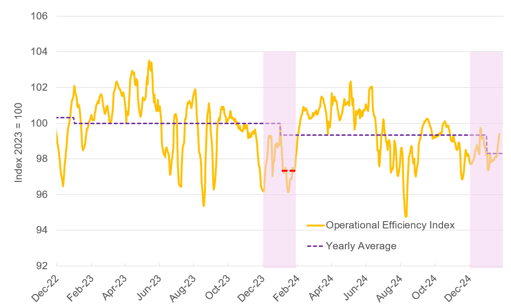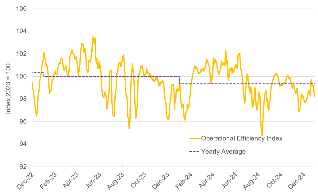 While operational efficiency is just one of many market indicators, its impact on capacity dynamics is significant. The current decline in efficiency creates a cascading effect: carriers face higher operational costs and reduced productivity, which leads to tighter capacity and potentially higher rates. This ultimately affects the entire supply chain ecosystem, from shippers managing their logistics budgets to consumers experiencing potential delays or price increases.