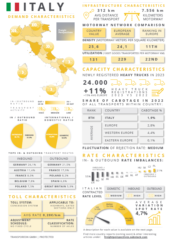 The characteristics of Italy`s road transportation sector are largely influenced by the economic structure of the country. The Northern regions, because of their higher demand and better developed infrastructure, impact the rate level and available capacity.