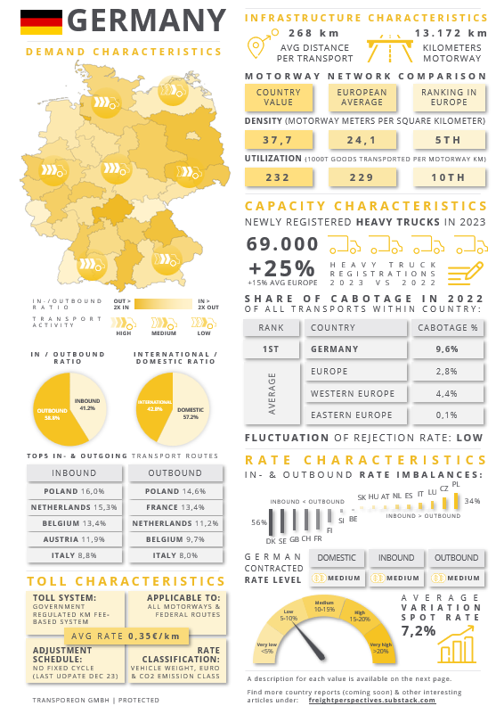 Germany's transportation market is characterized by a unique blend of high domestic demand and significant international involvement. While there is substantial demand for domestic transportation, many of these transports are handled by foreign carriers through cabotage. This means Germany relies on non-German carriers to meet capacity needs and maintain average rate levels. Germany´s central location in Europe, along with its strong manufacturing sector and extensive infrastructure, makes it an attractive market for foreign carriers, especially those from Eastern Europe, operating in Western Europe.