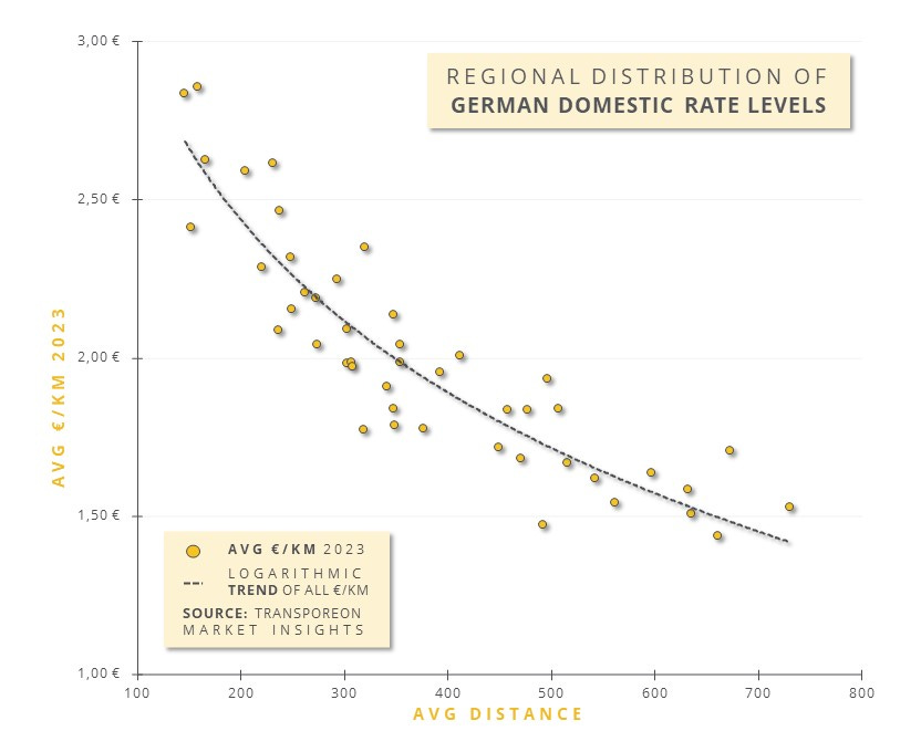 As expected, the cost per kilometer decreases with increasing distance across all regions in Germany. However, significant differences exist even for identical distances. Between regions, the data shows that the price level is higher in Western Germany compared to Eastern Germany. This can be attributed to the proximity of Eastern regions to Poland and the Czech Republic, where local transport is sometimes handled by lower-cost freight forwarders from these countries. For East-West connections, transport from East to West is more expensive than the reverse, driven by higher demand for transports into Western Germany compared to the East.