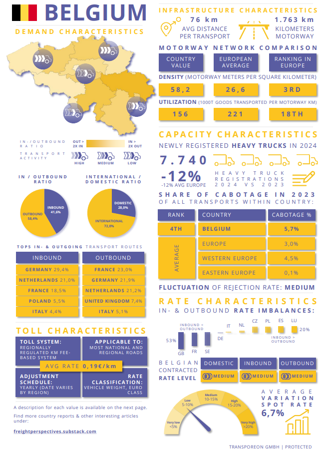 Belgium's transport market exemplifies efficiency in action. With its high international trade volume, extensive motorway network, and strategic location, the country serves as a vital hub for European logistics. The stable market conditions, characterized by consistent capacity availability and competitive pricing, create an attractive environment for both shippers and carriers.