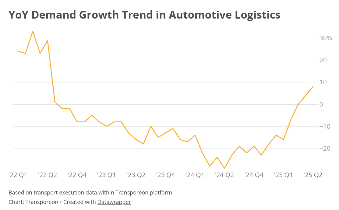 Following the initial shock of the pandemic, the automotive sector experienced a robust recovery in logistics demand. This was driven by a combination of pent-up consumer demand for vehicles and OEMs' efforts to work through production backlogs that had accumulated due to supply chain disruptions. However, the momentum soon began to falter. From 2022 through the end of 2024, the industry's transport demand experienced ten consecutive quarters of negative YoY growth, hitting the bottom in mid-2024.